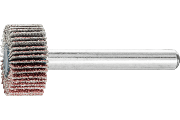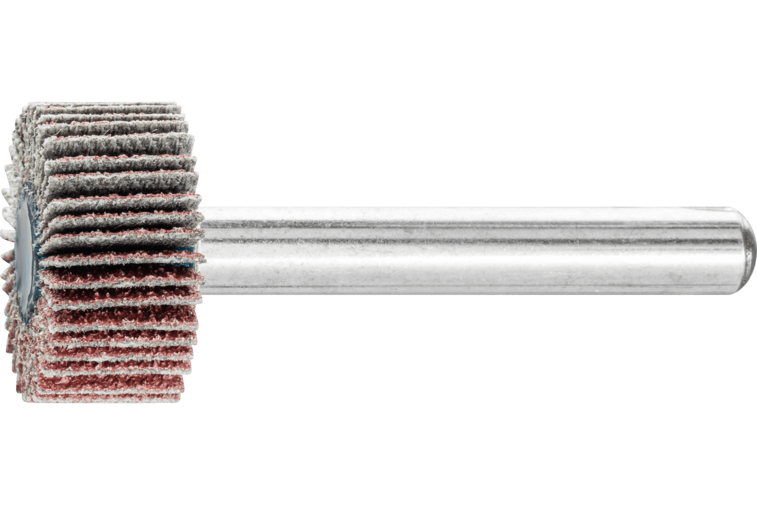 On mounted flap wheels, the flaps made of coated abrasive are arranged radially around the tool axis in a fan-type structure. Their flexibility enables them to adapt perfectly to the contours of the workpiece. The abrasive grain is embedded in the sturdy, flexible cloth backing material by means of a resinoid bond. In ISO 3919, mounted flap wheels are designated as “flap wheels with shaft”. For general applications from coarse to fine grinding.