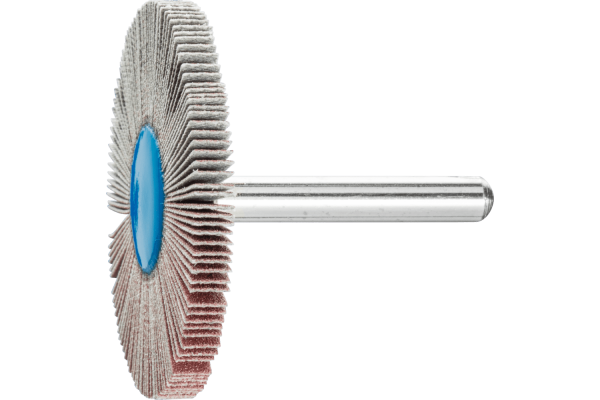 On mounted flap wheels, the flaps made of coated abrasive are arranged radially around the tool axis in a fan-type structure. Their flexibility enables them to adapt perfectly to the contours of the workpiece. The abrasive grain is embedded in the sturdy, flexible cloth backing material by means of a resinoid bond. In ISO 3919, mounted flap wheels are designated as “flap wheels with shaft”. For general applications from coarse to fine grinding.