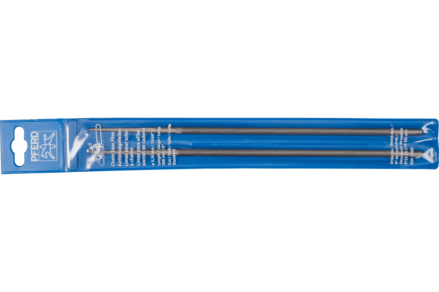 Chain saw files by PFERD are used around the world for sharpening saw chains. They can be used individually with a handle or in combination with depth gauge files with the popular CHAIN SHARP chain saw sharpeners. Two round Classic Line files with spiral cut in promotional plastic packaging to protect against dirt and damage. Round files for manual sharpening of saw chains with precise spiral cut for outstanding sharpness and particularly long tool life. For fast, score-free sharpening of saw teeth. In comparison to machine sharpening, these files remove stock sparingly without thermal loads due to friction on the metal.