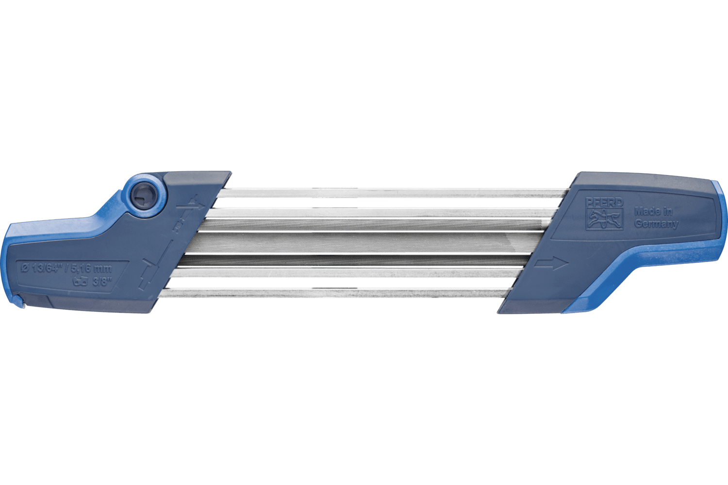 The PFERD product range includes sharpeners for both manual and mechanical sharpening of saw chains. Sharpeners from PFERD stand out due to their long tool life and ease of use. Chain saw sharpeners from PFERD are exceptionally well-suited to the manual sharpening of saw chains. Manual sharpening is more economical and much more gentle than machine-based sharpening, and prolongs the operating life of the saw chain if resharpened at an early stage. The CHAIN SHARP CS-X chain saw sharpener stands out due to its very good file position, ergonomic shape and easier operation. The device provides a sharpening angle of 30°. The chain saw sharpener comprises a sharpener, a Classic Line chain saw file and a depth gauge file. It is supplied with detailed operating instructions in a transparent, reusable plastic pouch which protects against damage and dirt.