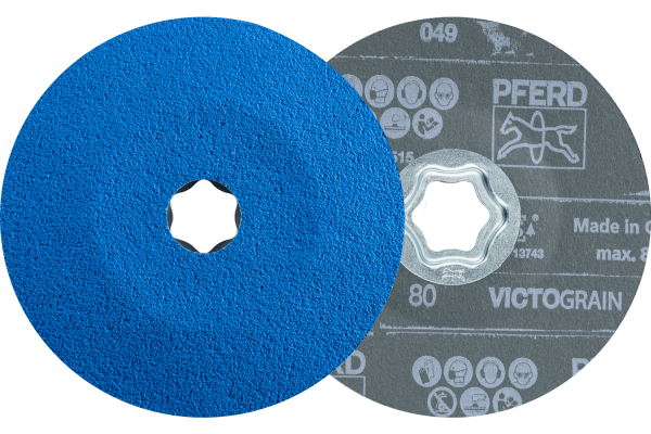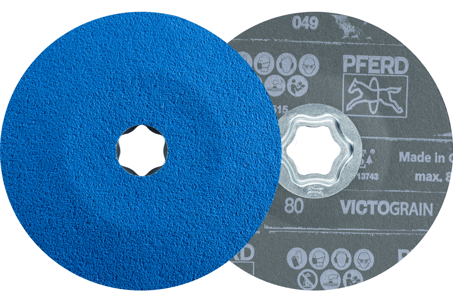 The COMBICLICK system consists of a specially developed backing pad and a rugged mounting system at the back of the tool. With the backing pad, COMBICLICK tools can be used on commercially available angle grinders. The unique geometry of the cooling slots ensures high air throughput, which in turn considerably reduces the thermal load on the abrasive material and the workpiece. Compared with conventional tools, the quick-mounting system, robust holder, secure tool-locking feature and integrated cooling system together achieve a workpiece temperature that is 30 % lower, a 25 % higher stock removal rate, a 30 % longer tool life, and better utilization of the abrasive material. PFERD fibre discs are manufactured in accordance with ISO 16057 in shape A1 version F under the designation “vulcanized fibre disc”. For maximum aggressive grinding with an extremely long tool life and an outstanding stock removal rate on steels and materials which are hard or have poor heat-conducting properties. Outstanding, constant high performance thanks to the VICTOGRAIN abrasive grain. Active grinding additives in the coating substantially improve the stock removal rate, prevent clogging and result in cooler grinding.