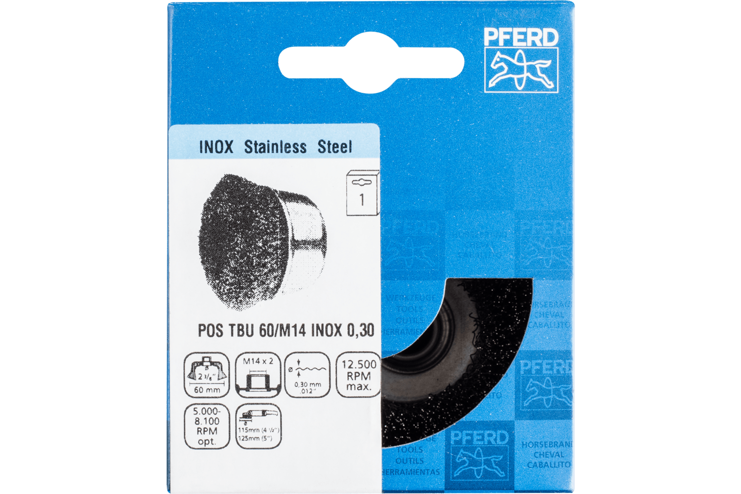 Excellent for medium-duty brushing such as deburring, cleaning and derusting on large surfaces. In order to fulfil the particular requirements for working with stainless steel (INOX), PFERD uses wire quality 1.4310 (V2A) for all INOX brushes. Practical experience from industry has shown that this offers very good corrosion resistance with an optimum tool life. All PFERD brushes with INOX filaments are colour-coded in blue and are suitable for use on all stainless steels (INOX), such as V4A. The wire quality 1.4310 tends to become ferromagnetic in the case of cold working; i.e. it can be attracted using magnets.;The reason for this is a change in the microstructure caused by deformation (e.g. during the wire drawing process). This does not have any impact on the quality and corrosion resistance of the INOX filament. The filament is still resistant to corrosion. Stainless steel wire (INOX) withstands temperatures up to 450 °C.