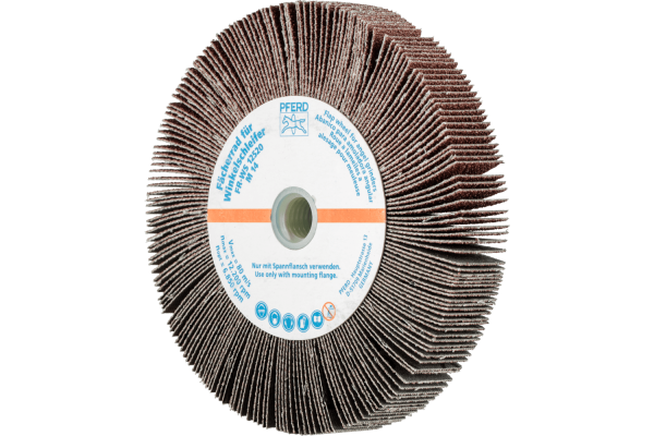 On unmounted flap wheels, the flaps made of coated abrasive are arranged radially around the tool axis in a fan-type structure. Their flexibility enables them to adapt perfectly to the contours of the workpiece. The abrasive grain is embedded in the sturdy, flexible cloth backing material by means of a resinoid bond. In ISO 5429, unmounted flap wheels are designated as “flap wheels”. The ideal tool for use on angle grinders in assembly shop operations. For general applications from coarse to fine grinding.