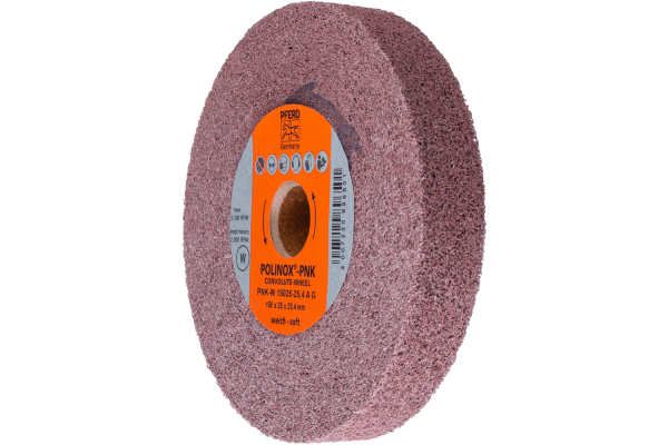 POLINOX convolute wheels PNK produce matt surface finishes. POLINOX convolute wheels PNK consist of spiral-shaped, non-woven abrasive which is wound around a core and foamed up. The foam supports the non-woven component and positively impacts its tool life and abrasive performance. This particular bond results in non-woven wheels with a very good surface finish, high stock removal rate and long tool life. These properties are particularly apparent when deburring, blending, finishing and polishing soft metals, alloyed and high-alloy steels, in addition to titanium alloys.;The wheels can be used on stationary machines and bench grinders, in addition to portable tool drives such as straight grinders. By dressing the wheels, they can also be adapted to the geometry of special workpieces. Soft version with very good abrasive performance on contours. Very good for blending surfaces.