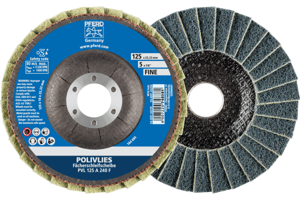 For general coarse to fine grinding applications in industry and professional trades. They are especially well-suited to work on large stainless steel (INOX) surfaces. POLIVLIES grit size 240 F = fine (blue)