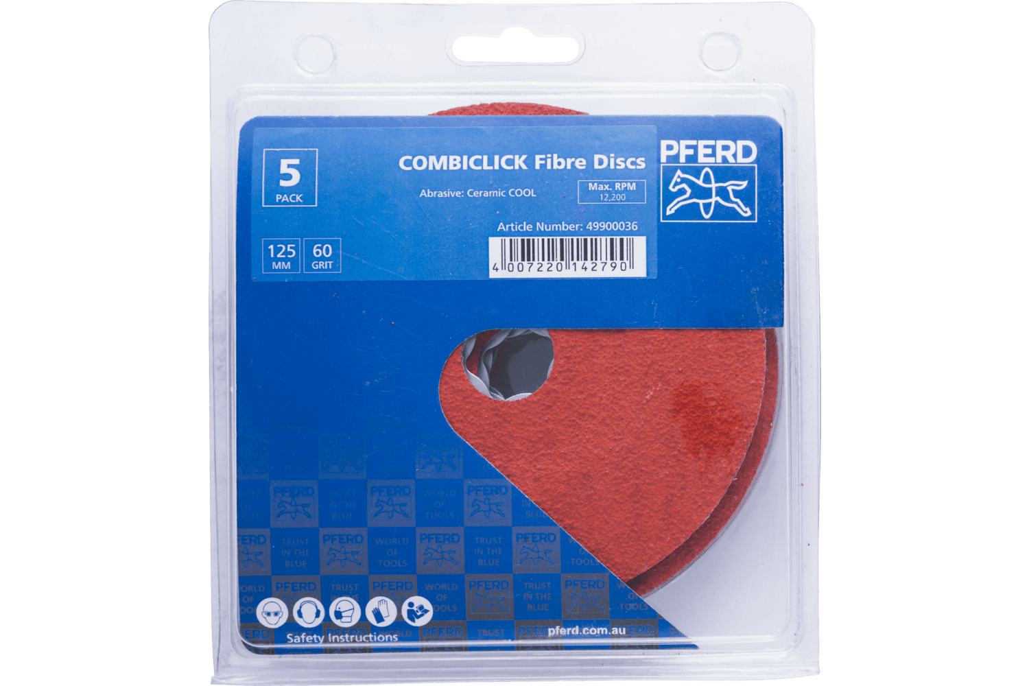 The COMBICLICK system consists of a specially developed backing pad and a rugged mounting system at the back of the tool. With the backing pad, COMBICLICK tools can be used on commercially available angle grinders. The unique geometry of the cooling slots ensures high air throughput, which in turn considerably reduces the thermal load on the abrasive material and the workpiece. Compared with conventional tools, the quick-mounting system, robust holder, secure tool-locking feature and integrated cooling system together achieve a workpiece temperature that is 30 % lower, a 25 % higher stock removal rate, a 30 % longer tool life, and better utilization of the abrasive material. PFERD fibre discs are manufactured in accordance with ISO 16057 in shape A1 version F under the designation “vulcanized fibre disc”. For aggressive grinding with maximum stock removal rate on hard materials which do not conduct heat well. Consistently high performance due to self-sharpening ceramic oxide grain. Active grinding additives in the coating substantially improve the stock removal rate, prevent clogging and result in cooler grinding.