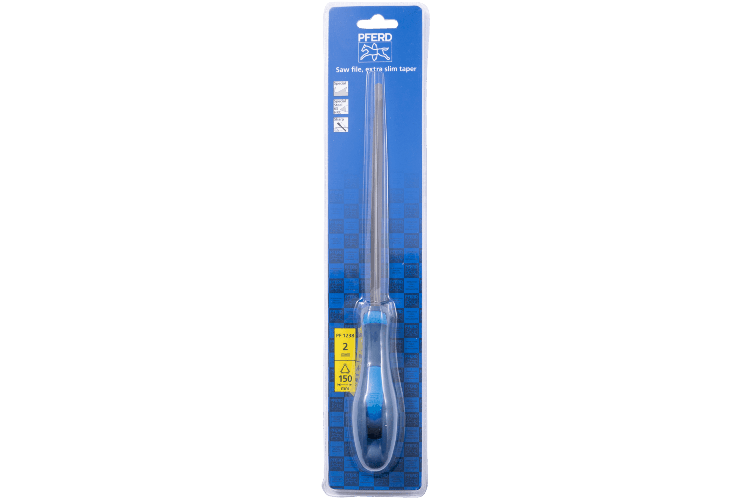 Three square saw files from PFERD are triangular tapered files with tang. The saw files are suitable for use on steel and cast steel and especially suitable for sharpening sawing tools. PFERD offers three square saw files in various versions and shapes. Triangular files, tapered to the tip with tang. Cut on three sides and three edges. Single cut for general sharpening tasks. Files are supplied in blister packaging with a handle.