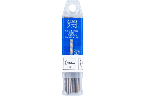 Drilling tools with cross grinding for industrial uses. Fully ground, right-hand turning versions that produce precise drill holes thanks to their high concentricity and exact centring. PFERD offers spiral drills in the STEEL (118 ° point angle) and INOX (135 ° point angle) versions. High-performance drilling tools in the INOX in HSSE-Co5 (M35) version for industrial uses. Fully ground right-hand turning version with cross grinding that produces precise drill holes thanks to their high concentricity and exact centring.