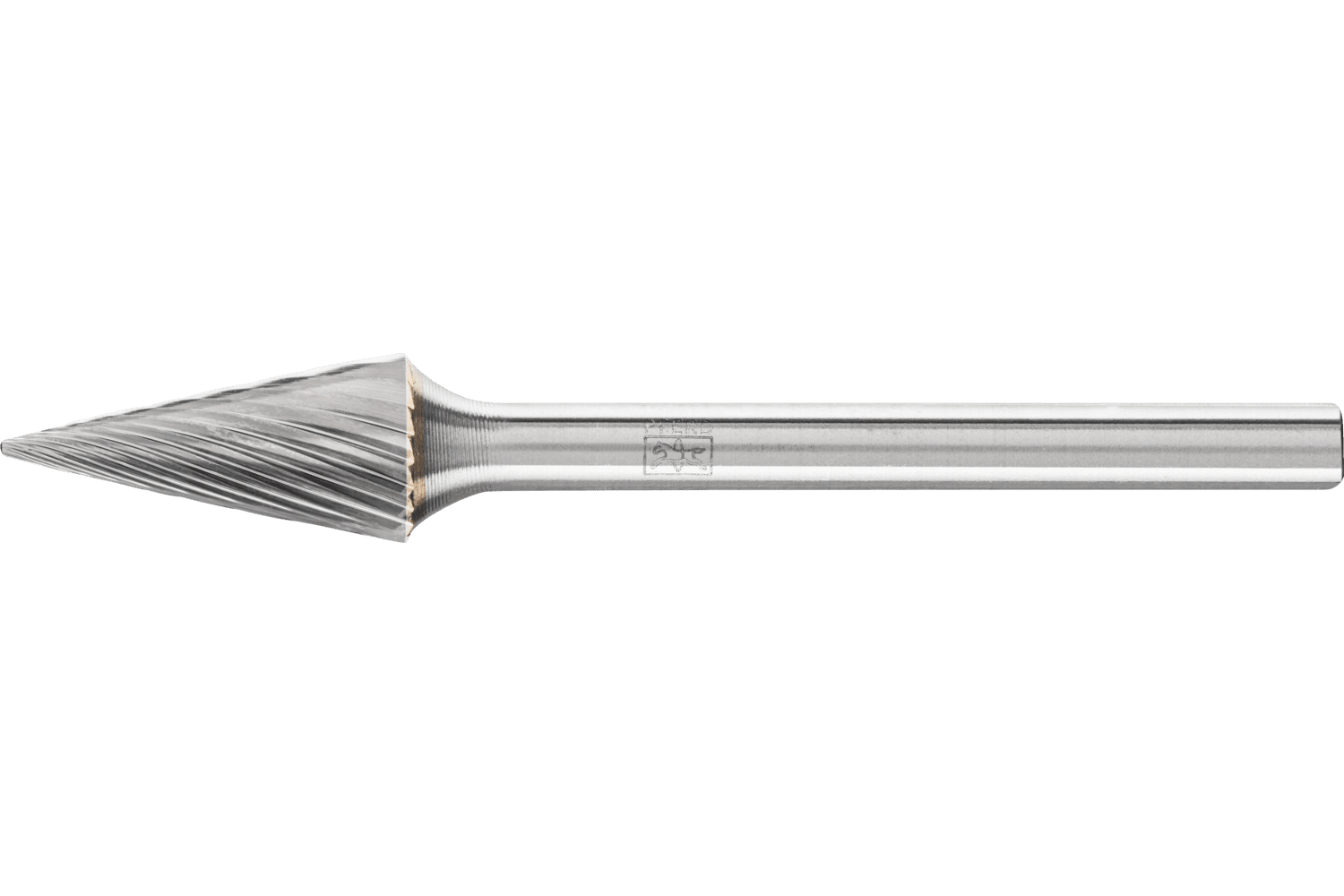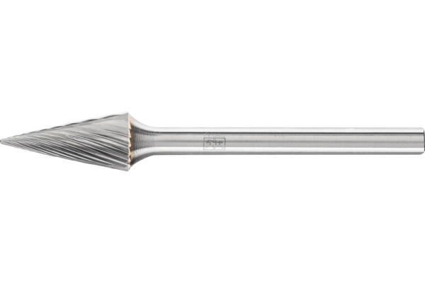Cut 5 is especially well-suited to fine machining of cast iron, steel, stainless steel (INOX) and high-temperature-resistant materials such as nickel-based and cobalt-based alloys. It achieves a good surface. Tungsten carbide burrs for general applications are suitable for fine and coarse stock removal on the key materials used in industrial manufacturing. They provide a good stock removal rate and are not specific to a particular material. Conical pointed burr according to DIN 8032 with cut conforming to DIN 8033, flattened tip.