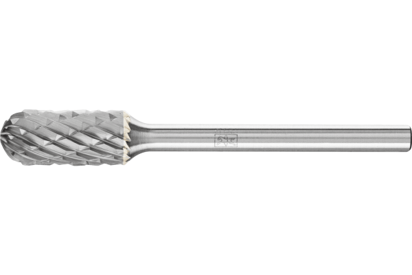 Cut 3 PLUS is cross cut and especially well-suited to machining of cast iron, steel, stainless steel (INOX), nickel-based alloys and titanium alloys. It is characterized by its high stock removal rate. Tungsten carbide burrs for general applications are suitable for fine and coarse stock removal on the key materials used in industrial manufacturing. They provide a good stock removal rate and are not specific to a particular material. Cylindrical burr with radius end according to DIN 8032 with cut conforming to DIN 8033. Combination of cylindrical and ball-shaped geometries.