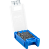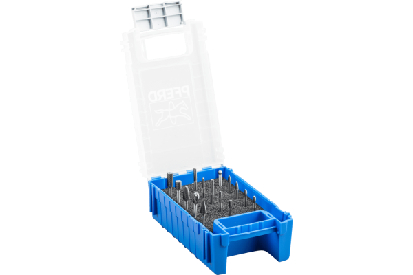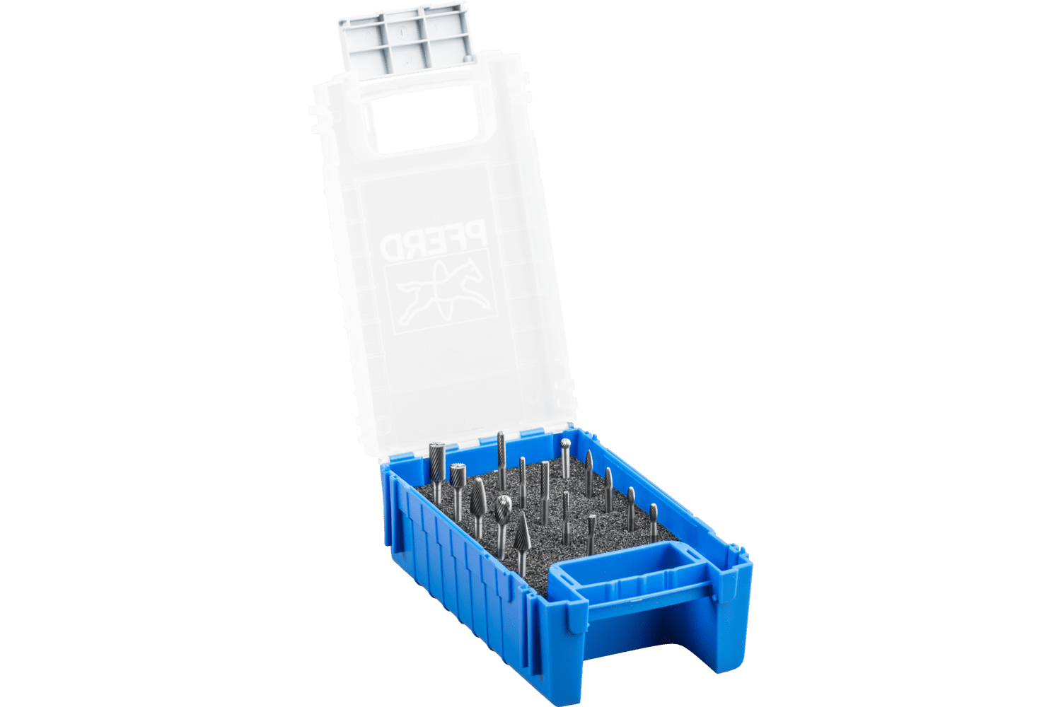 Cut 5 is especially well-suited to fine machining of cast iron, steel, stainless steel (INOX) and high-temperature-resistant materials such as nickel-based and cobalt-based alloys. It achieves a good surface. Tungsten carbide burrs for general applications are suitable for fine and coarse stock removal on the key materials used in industrial manufacturing. They provide a good stock removal rate and are not specific to a particular material. Set 1501 – cut 5 – contains 15 small tungsten carbide burrs in the most common shapes and dimensions for general applications. The sturdy plastic box protects the tools from dirt and damage.